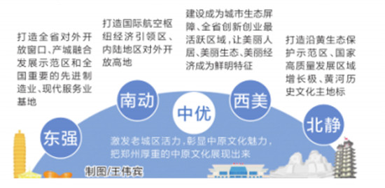 其中,“東強”明確以鄭東新區(qū)為依托,統(tǒng)籌經(jīng)開區(qū)、中牟縣部分區(qū)域,統(tǒng)籌自貿(mào)試驗區(qū)、跨境電商綜試區(qū)、國家大數(shù)據(jù)綜試區(qū)、金融集聚核心功能區(qū)等戰(zhàn)略平臺建設(shè),打造全省對外開放窗口、產(chǎn)城融合發(fā)展示范區(qū)和全國重要的先進制造業(yè)、現(xiàn)代服務(wù)業(yè)基地!澳蟿印,明確依托航空港經(jīng)濟綜合實驗區(qū),圍繞“樞紐+口岸+物流+制造”,完善以航空樞紐為帶動的多式聯(lián)運體系,打造國際航空樞紐經(jīng)濟引領(lǐng)區(qū)、內(nèi)陸地區(qū)對外開放高地!拔髅馈,明確統(tǒng)籌高新區(qū)、中原區(qū)等西部區(qū)域發(fā)展,將其建設(shè)成為城市生態(tài)屏障、全省創(chuàng)新創(chuàng)業(yè)最活躍區(qū)域,讓美麗人居、美麗生態(tài)、美麗經(jīng)濟成為西部的鮮明特征!氨膘o”,明確圍繞國家黃河流域生態(tài)保護和高質(zhì)量發(fā)展戰(zhàn)略,加強黃河流域生態(tài)保護治理,推進黃河文化遺產(chǎn)的系統(tǒng)保護,打造沿黃生態(tài)保護示范區(qū)、國家高質(zhì)量發(fā)展區(qū)域增長極、黃河歷史文化主地標(biāo)。“中優(yōu)”,明確通過城市有機更新,激發(fā)老城區(qū)活力,彰顯中原文化魅力,真正把鄭州厚重的中原文化展現(xiàn)出來。