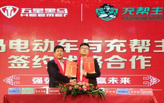 充幫主電動車充電器創(chuàng)始人侯建華(左)與五星黑馬電動車董事長呂高杰先生簽約