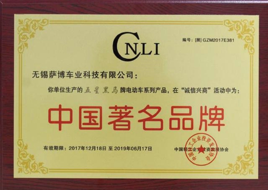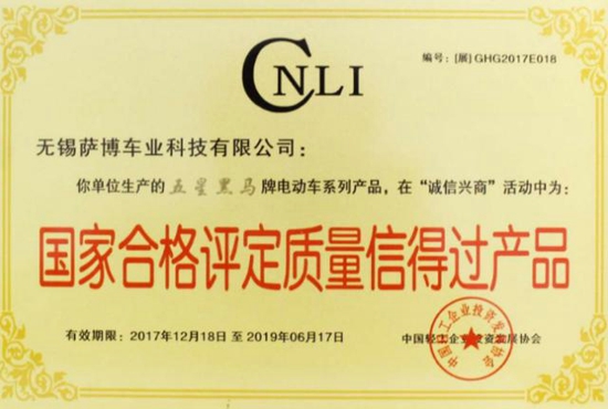 2018年,經(jīng)層層嚴(yán)格篩選評審,五星黑馬電動車又獲得了中國輕工企業(yè)投資發(fā)展協(xié)會授予的“中國著名品牌”和“國家合格評定質(zhì)量信得過產(chǎn)品”榮譽證書。
