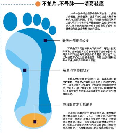 他分析說,鞋底磨損反映的常見病是內(nèi)八字和外八字。內(nèi)八字走路容易使更多的壓力積聚在腳外側(cè),增大了關(guān)節(jié)的壓力,時間久了會形成O形腿。