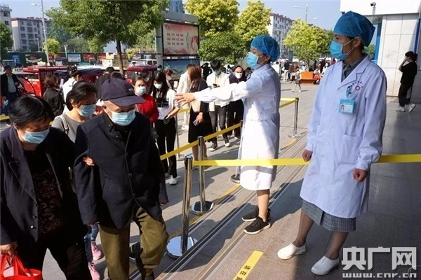 醫(yī)院門診大樓前已經(jīng)有不少患者和家屬在醫(yī)護(hù)人員、醫(yī)院志愿者和保衛(wèi)人員的引導(dǎo)下,井然有序的排隊著,每個人都佩戴著口罩,間隔一定的距離,有序地在醫(yī)務(wù)人員的引導(dǎo)下,通過測溫走廊設(shè)置紅外測溫門,進(jìn)行體溫監(jiān)測。