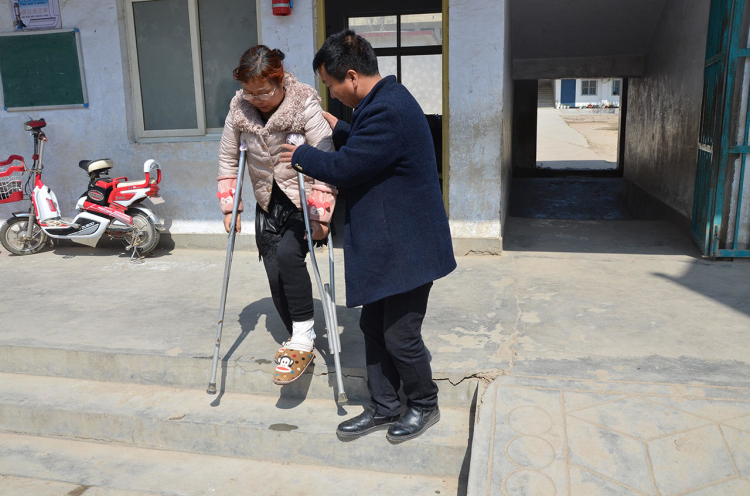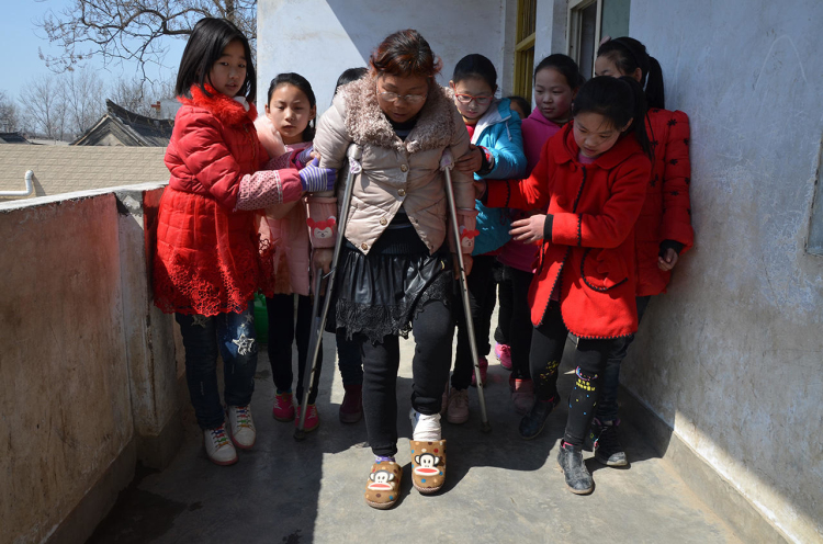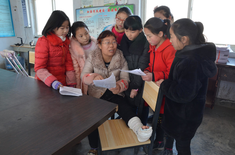 薛老師的左腿打了夾板,下垂時間長了會腫脹,所以她一上課,學生們就給她搬來一個凳子,把受傷的腿支起來。需要板書的時候,她就蜷起傷腿,靠一條腿撐地。