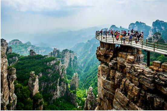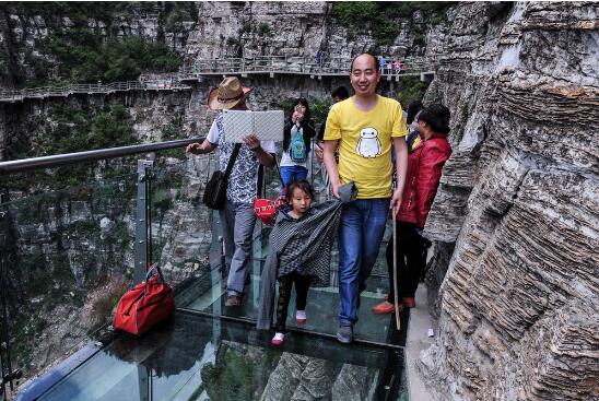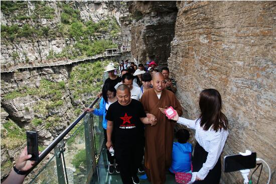 延參法師跟游客共同體驗(yàn)玻璃棧道的驚險(xiǎn)刺激