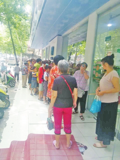 昨天下午3時,記者再次來到這家大藥房時,發(fā)現(xiàn)在門口排隊的老人有近百人。天氣炎熱,老人們大多帶著扇子和折疊凳,坐在藥房門前的臺階上排隊等候。