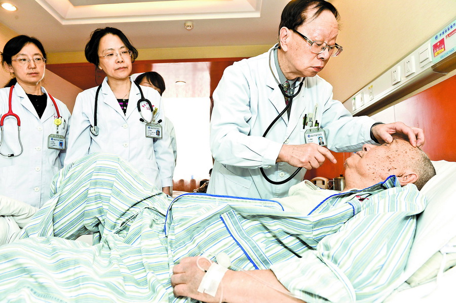 在新疆醫(yī)科大學(xué)第一附屬醫(yī)院第二住院大樓的一間病房內(nèi),何秉賢(右二)正在查看住院患者的恢復(fù)情況(資料圖片)。 新華社記者王菲攝