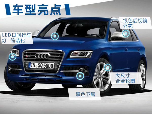SQ5作為Q5的運(yùn)動(dòng)版車(chē)型,定位于中大型SUV,車(chē)身將采用S-Line 套件,,并采用重新調(diào)教的底盤(pán),尺寸方面將比現(xiàn)款Q5稍大,另外新車(chē)的離地間隙也將有所降低。外觀方面,其銀色后視鏡外殼、20寸合金輪轂以及充滿運(yùn)動(dòng)感覺(jué)得黑色下唇均標(biāo)識(shí)了其“S”系列的身份。