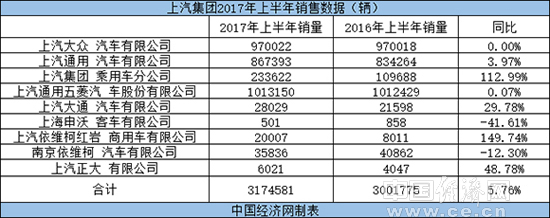 央廣網(wǎng)河南分網(wǎng)消息 隨著上海汽車集團股份有限公司(以下簡稱“上汽集團”)近期公布了其2017年6月份產(chǎn)銷快報,上汽集團上半年銷售數(shù)據(jù)也隨之出爐:2017年上半年,上汽集團銷售汽車3174581輛,同比增長5.76%。