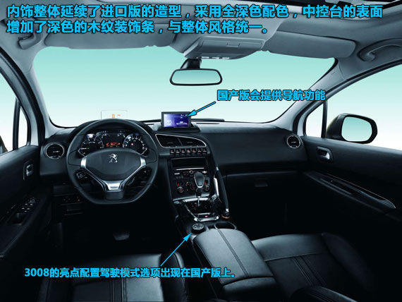 內(nèi)飾方面,東風(fēng)標(biāo)致3008沿用了進(jìn)口版本的整體設(shè)計(jì),資料圖中的車型采用了全黑色的深色內(nèi)飾,細(xì)節(jié)部分點(diǎn)綴有鍍鉻裝飾。與進(jìn)口版有所不同,國(guó)產(chǎn)后的東風(fēng)標(biāo)致3008中控臺(tái)的面板采用了深色的木紋裝飾,這應(yīng)該是針對(duì)國(guó)人口味而做出的調(diào)整。深色的木紋與同樣深色的內(nèi)飾風(fēng)格一致,并不突兀。