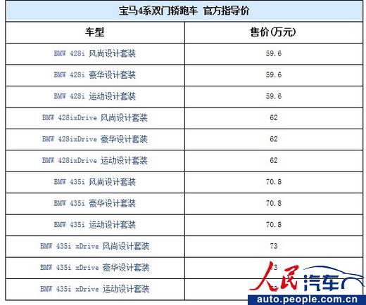 央廣網(wǎng)河南分網(wǎng)消息 據(jù)人民網(wǎng)報道:11月12日,寶馬4系Coupe正式在國內(nèi)上市。共推出十二款車型,包括428i、428i xDrive、435i和435i xDrive。分別為搭載2.0T發(fā)動機及3.0T發(fā)動機。并擁有兩驅(qū)和四驅(qū)版本供消費者選擇,且每款車將推出不同配置的設(shè)計套裝。售價區(qū)間為59.6-73萬元區(qū)間。
