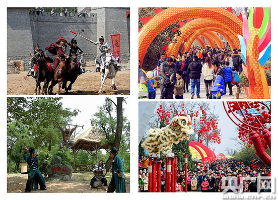 本屆廟會(huì)以《水滸傳》、《岳飛傳》、《七俠五義》等歷史名著為主要武俠文化背景,推出了36部(每天60多場(chǎng)表演)實(shí)景武俠劇,全景式、系統(tǒng)化展現(xiàn)了大宋武俠豪情及江湖百態(tài)。以攻城、馬戰(zhàn)、煙火、爆破為演出特色的大型實(shí)景巨制《三打祝家莊》也在廟會(huì)上演。