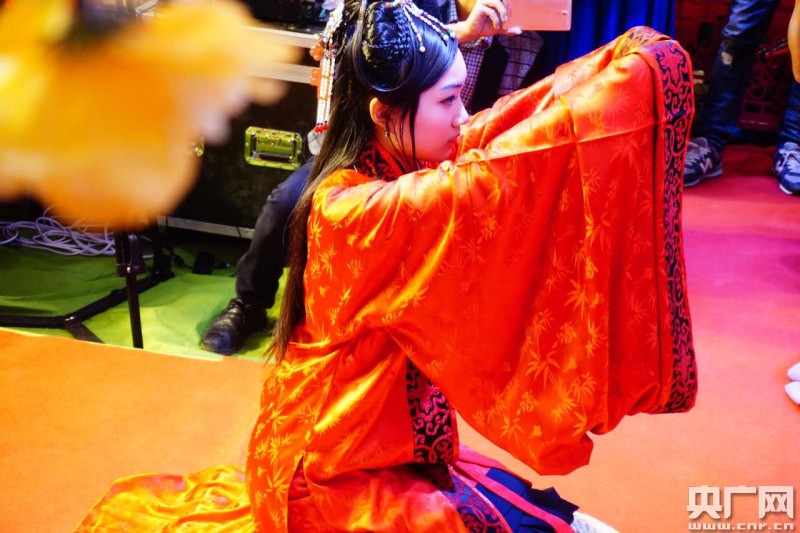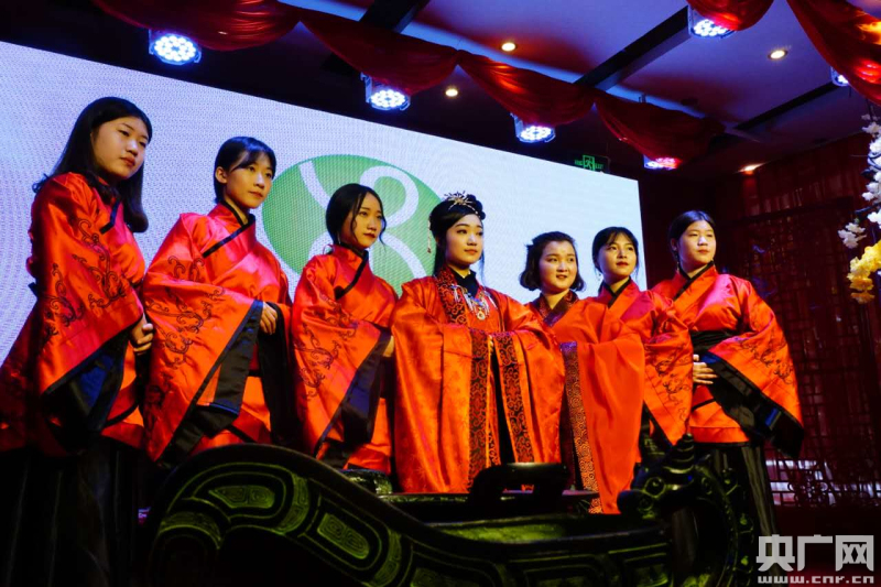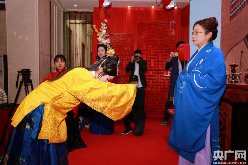 在悠揚宏厚的音樂聲中,成人笄禮拉開了帷幕。一名女孩身著漢服,挽起發(fā)髻,漸次穿上華麗的服飾,通過加冠笄、聆訊等中華民族傳統(tǒng)成人禮儀式,宣告自己正式成年。
