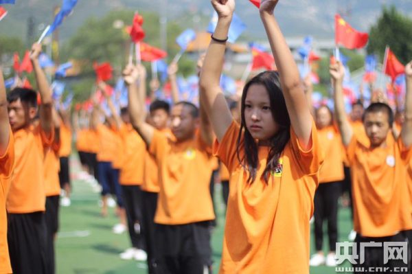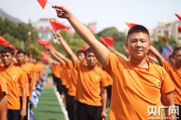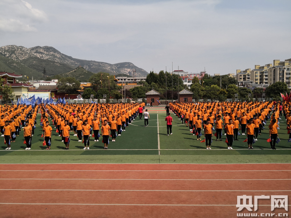在登封文武學(xué)校,當(dāng)音樂響起,由該校學(xué)生組成的千人方陣被瞬間"點(diǎn)燃"。他們動(dòng)作整齊劃一,手持國(guó)旗、會(huì)旗變換不同造型,與音樂節(jié)點(diǎn)完美融合,給人以美的享受、視覺的震撼和精神的洗禮。