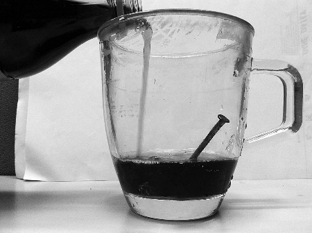 昨天中午12點(diǎn),記者針對(duì)微博上熱炒的“可樂(lè)去銹”事件,買(mǎi)來(lái)某品牌500毫升可樂(lè)一瓶,隨后將兩枚4厘米長(zhǎng)銹跡斑斑的鐵釘放入透明的6厘米高的玻璃杯子里,開(kāi)始做浸泡實(shí)驗(yàn)。