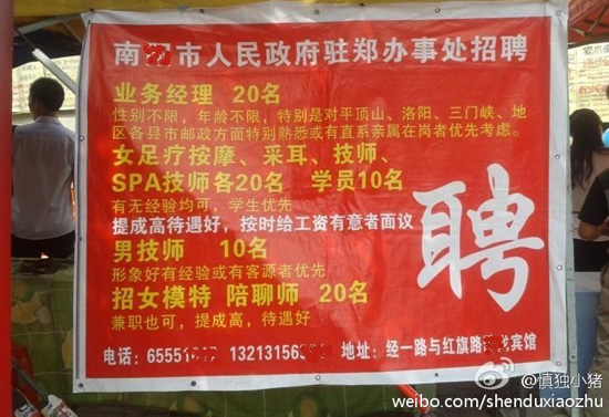 中廣網(wǎng)河南分網(wǎng)消息 據(jù)大公中原新聞網(wǎng)報道:10日,據(jù)新浪微博網(wǎng)友 @刀刀的幻想 爆料,在河南省人才市場門口有一則招聘啟事,招聘單位為南陽市人民政府駐鄭州辦事處某賓館,招聘職位竟有女足療按摩、SPA技師、男技師、女模特、陪聊師等,該微博立即引起網(wǎng)友圍觀。