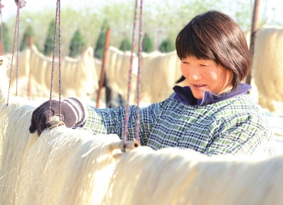 央廣網(wǎng)河南分網(wǎng)消息 據(jù)河南日報農(nóng)村版報道:11月28日,正陽縣綠色薯業(yè)生產(chǎn)專業(yè)合作社的社員正在晾曬粉條。目前該合作社已發(fā)展有200多個紅薯種植示范基地,種植紅薯面積達3000多畝,帶動發(fā)展社員500多戶,每年可加工紅薯600萬斤。(王珺 攝)