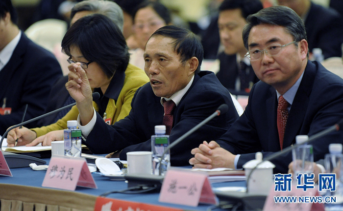 全國(guó)人大代表李連成(前中)是河南省濮陽(yáng)縣西辛莊村黨支部書(shū)記,他的雄心壯志是把西辛莊村建成中國(guó)首個(gè)“村級(jí)市”。他說(shuō),我們建“村級(jí)市”,就是就近城鎮(zhèn)化,可以減少城市的壓力,也能縮小城鄉(xiāng)差別,讓農(nóng)民享受到和城市一樣的生活便利。(新華社記者 李博攝)