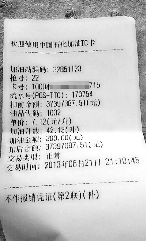 記者看了這張小票的照片,顯示卡主21日晚9點(diǎn)10分加了300元的油,加油站編碼、加油卡卡號(hào)等都有,扣后金額為37397087.51元。