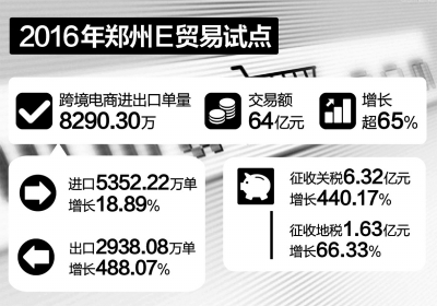 數(shù)字見證變化。2015年,鄭州E貿(mào)易試點業(yè)務(wù)量5109.15萬單。2016年業(yè)務(wù)量已突破8000萬單,其中進口5352.22萬單,同比增長18.89%;出口2938.08萬單,同比增長488.07%。征收關(guān)稅6.32億元,同比增長440.17%;征收地稅1.63億元,同比增長66.33%。此外,新引進企業(yè)199家,目前已吸引電商、網(wǎng)商、物流、倉儲、報關(guān)、第三方支付等1101家企業(yè)集聚鄭州,搭建了跨境電子商務(wù)較為完善的產(chǎn)業(yè)鏈和生態(tài)鏈。
