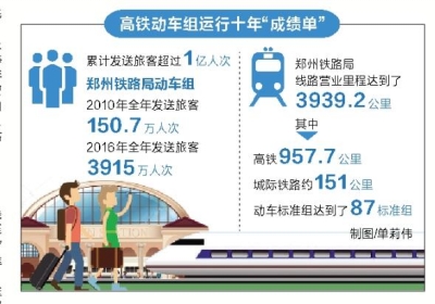 據(jù)統(tǒng)計(jì),自我省首列動(dòng)車(chē)組上線十年來(lái),鄭州鐵路局線路營(yíng)業(yè)里程至今達(dá)到了3939.2公里,其中高鐵957.7公里,城際鐵路約151公里,動(dòng)車(chē)標(biāo)準(zhǔn)組達(dá)到了87標(biāo)準(zhǔn)組。