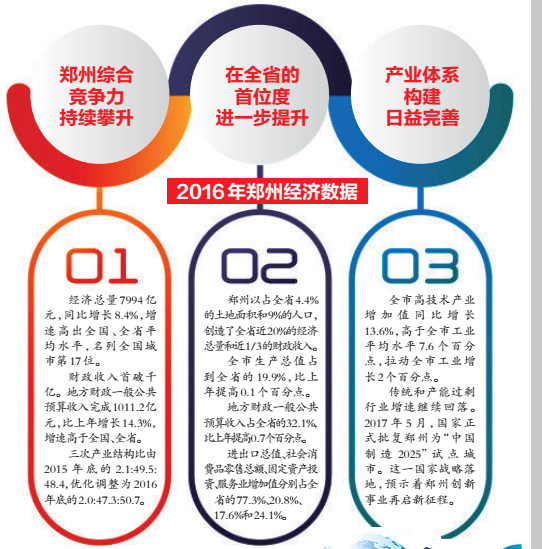 中國(河南)創(chuàng)新發(fā)展研究院院長喻新安說:“鄭州入圍全球城市經濟競爭力百強,說明鄭州的經濟實力、經濟發(fā)展的潛力以及在全球的影響力,都有了顯著提升,這在鄭州發(fā)展史上具有里程碑意義!贝舜稳肓邪購娨脖砻髁肃嵵萁陙淼膽(zhàn)略選擇是非常正確的,堅持開放帶動、搭建創(chuàng)新平臺、加快新興產業(yè)的快速發(fā)展等,取得的成績十分令人鼓舞。