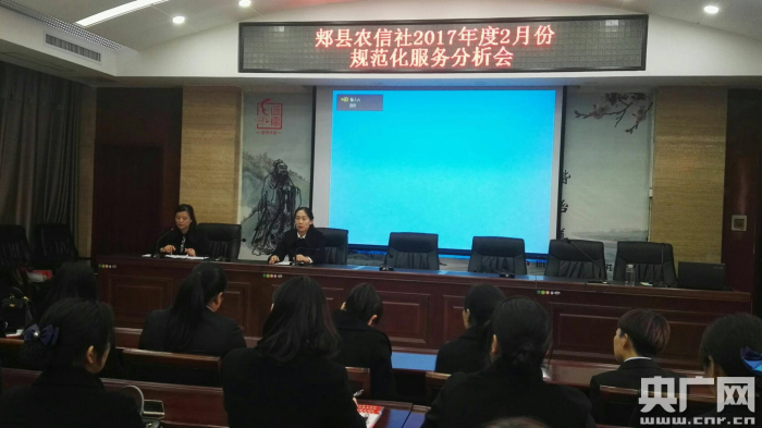 央廣網(wǎng)河南分網(wǎng)3月9日消息 為進(jìn)一步強化服務(wù)意識、提高服務(wù)質(zhì)量,推動郟縣聯(lián)社規(guī)范化服務(wù)工作再上新臺階,3月7日下午,郟縣聯(lián)社在南二樓會議室召開2017年二月份規(guī)范化服務(wù)分析會。運營管理部同各社主任、網(wǎng)點負(fù)責(zé)人、大堂經(jīng)理及第三方公司共60余人參加了會議。