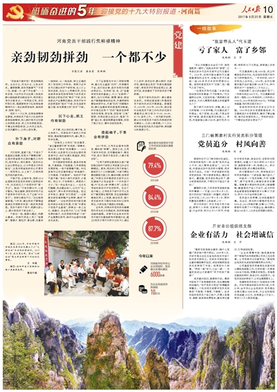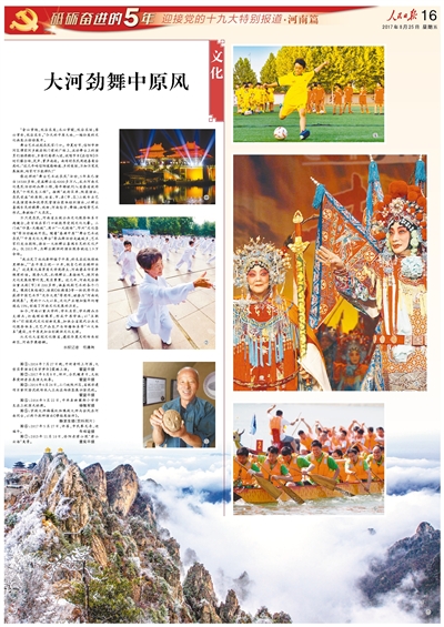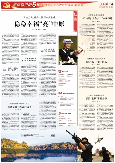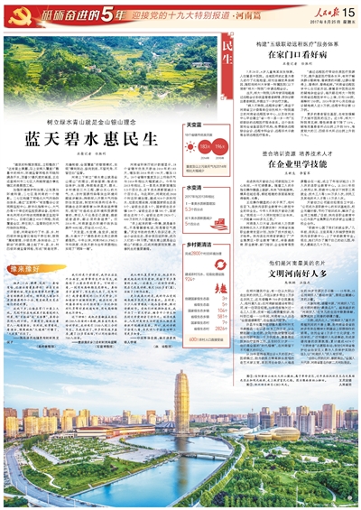 央廣網(wǎng)河南分網(wǎng)消息 今天《人民日報(bào)》以八個整版的篇幅,隆重推出“砥礪奮進(jìn)的五年”——迎接黨的十九大特別報(bào)道·河南篇。特別報(bào)道一版頭條刊發(fā)省委書記謝伏瞻署名文章《邁向全面小康 讓中原更加出彩》;五版頭條刊發(fā)省長陳潤兒訪談文章《抓住重要機(jī)遇期,打贏轉(zhuǎn)型攻堅(jiān)戰(zhàn)》。特別報(bào)道八個版一版為導(dǎo)讀,其他版分別從黨建、經(jīng)濟(jì)、開放、轉(zhuǎn)型、法治、民生、文化等方面,全面深入總結(jié)了黨的十八大以來河南經(jīng)濟(jì)社會發(fā)展的重大成就、突出變化、巨大進(jìn)步,充分展示了河南各界以昂揚(yáng)姿態(tài)和踏實(shí)作風(fēng)迎接黨的十九大勝利召開。