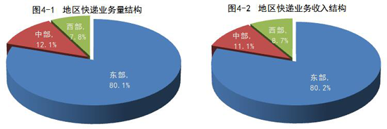 1-8月,東、中、西部地區(qū)快遞業(yè)務(wù)量比重分別為80.1%、12.1%和7.8%,業(yè)務(wù)收入比重分別為80.2%、11.1%和8.7%。與去年同期相比,東部地區(qū)快遞業(yè)務(wù)量比重下降了0.9個(gè)百分點(diǎn),快遞業(yè)務(wù)收入比重下降了0.8個(gè)百分點(diǎn);中部地區(qū)快遞業(yè)務(wù)量比重上升了0.4個(gè)百分點(diǎn),快遞業(yè)務(wù)收入比重上升了0.3個(gè)百分點(diǎn);西部地區(qū)快遞業(yè)務(wù)量比重和快遞業(yè)務(wù)收入比重均上升了0.5個(gè)百分點(diǎn)。