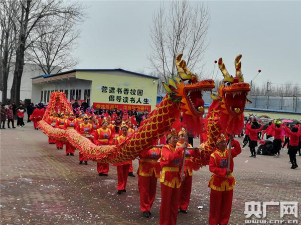 早上9:00,文藝展演在熱鬧的開場舞《火火的中國火火的時代》中正式拉開了序幕,歡快的旋律響徹校園,只見演員們個個身著盛裝翩翩起舞展現(xiàn)風(fēng)采,揮舞著手中的彩帶和燈籠,瞬間點燃了現(xiàn)場觀眾的熱情。隨著河村腰鼓隊的《舞天動地》、周莊舞蹈隊的《吉祥中國年》、小賀莊舞龍隊的《舞龍小品》和徐莊嗩吶的《恭喜發(fā)財》等節(jié)目的演出,活動迎來一波又一波的高潮,熱情洋溢的演出感染著現(xiàn)場所有觀眾,掌聲、笑聲、歡呼聲此起彼伏。