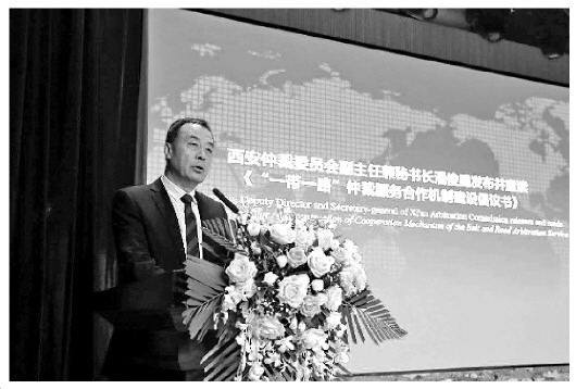 圖為西安仲裁委員會(huì)副主任兼秘書長(zhǎng)潘俊星代表14家機(jī)構(gòu)發(fā)布《“一帶一路”仲裁服務(wù)合作機(jī)制建設(shè)倡議》。 論壇主辦方供圖