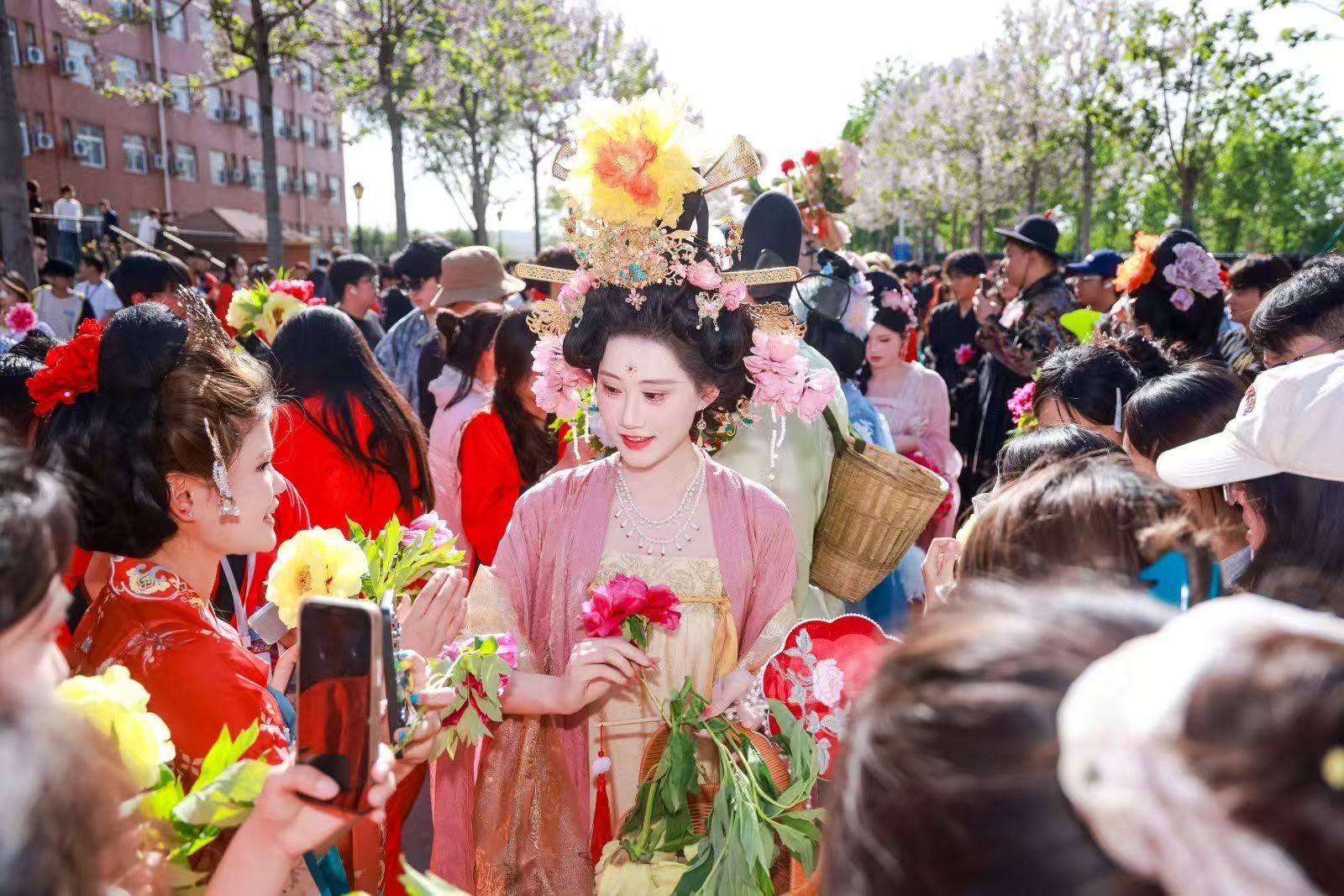 他們身披錦繡華服,結(jié)伴巡游,將一簇簇嬌艷的牡丹贈予路過的學(xué)子。接一朵牡丹,許一份期許,華服與笑臉相映,驚呼與歡笑交織。