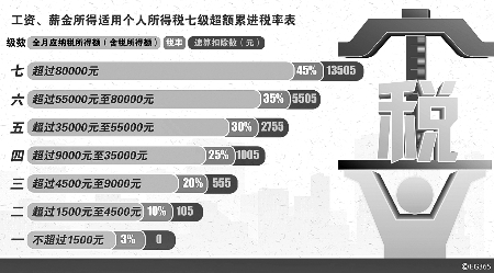 新個稅法實施后,工薪族每月獲得的薪金,先減除“三險一金”,再減除3500元費用,對超過部分,按超額累進(jìn)稅率分段計稅,總共分7級。即對不超過減除標(biāo)準(zhǔn)1500元的部分,按3%征稅;對超過1500元至4500元的部分,按10%征稅;對超過4500元至9000元的部分,按20%征稅……