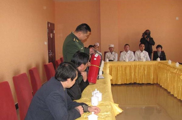 “著火了,請不要慌,我們的員工會將大家疏散到安全地帶!”隨著酒店內(nèi)應(yīng)急廣播的響聲。首先發(fā)現(xiàn)火災(zāi)的員工立即打電話給酒店義務(wù)消防隊報告情況,此時整個酒店內(nèi)應(yīng)急廣播系統(tǒng)發(fā)出緊急疏散命令,按照預(yù)先設(shè)定的演練方案,立即啟動應(yīng)急疏散方案。各在崗職工按各自的分工,分區(qū)域、分方向、分樓層,向各個疏散出口引導(dǎo)所有顧客進行安全疏散。同時,酒店內(nèi)義務(wù)消防隊人員組織進行撲救補起火災(zāi)。酒店的顧客在各樓層管理員的組織和引導(dǎo)下,捂著濕毛巾、彎著腰,有秩序的迅速向安全出口疏散,在安全區(qū)域集合。最后火場的“義務(wù)”消防隊員工用滅火器將火徹底撲滅,整個消防演練活動取得了圓滿成功。