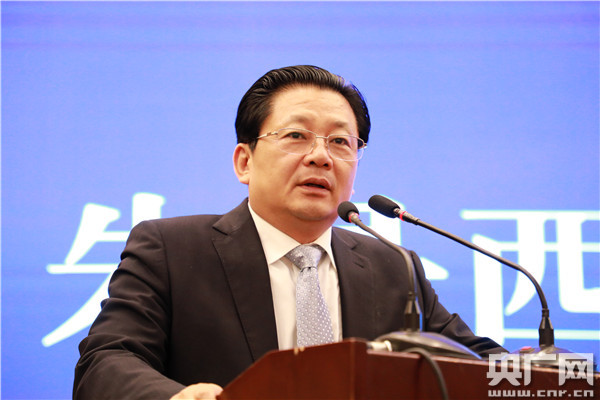 河南省駐馬店市委副書記、市長朱是西在中國(駐馬店)國際農(nóng)產(chǎn)品加工產(chǎn)業(yè)園專場推介會上介紹駐馬店市情及社會發(fā)展情況。(央廣網(wǎng)記者 汪寧 攝)