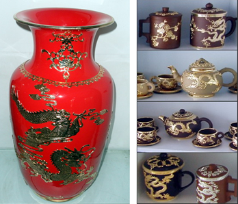 它以紫砂陶瓷和五大名瓷為坯,選金銀為飾品,采用古老工藝,經(jīng)冶煉鑄造、鏤雕、鑲嵌、光鍥處理等十幾道工藝,精雕細(xì)刻制成。把傳統(tǒng)文化中的福、祿、壽、喜,吉祥如意,名花異草,珍禽異獸等圖案鑲于器皿上,形象自然,栩栩如生,具有鮮明的民族地域文化特色和強(qiáng)烈的藝術(shù)魅力。