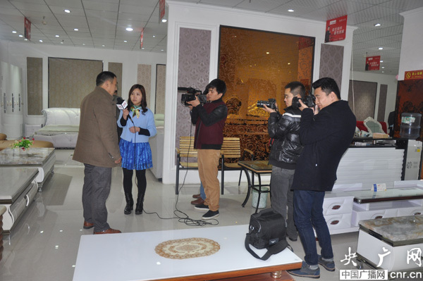 森悅家具店總經(jīng)理孫根奇在想采風(fēng)記者介紹創(chuàng)業(yè)情況