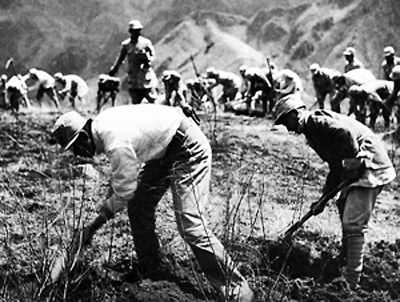 太行軍區(qū)部隊指戰(zhàn)員在一起開荒種地