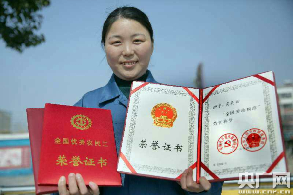 高美麗的付出得到了社會各界的認可,2008年11月,國務(wù)院農(nóng)民工工作聯(lián)席會上,她有幸被授予“全國優(yōu)秀農(nóng)民工”稱號。2009年,作為“全國優(yōu)秀農(nóng)民工”四人代表之一,登上了國慶60周年觀禮臺,受到了黨和國家領(lǐng)導(dǎo)人的親切接見。