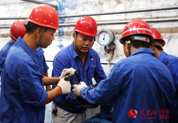 侯志勇(中)和同事們?cè)诎斏剿畯S的取水泵房更換閥門頭。