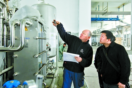 3月19日,德國專家在娃哈哈南陽基地指導(dǎo)安裝超凈果蔬飲料生產(chǎn)設(shè)備。娃哈哈集團(tuán)已在南陽建成13條食品、飲料生產(chǎn)線。新上馬的超凈果蔬飲料項目正抓緊施工。⑤2 本報記者 王天定 攝