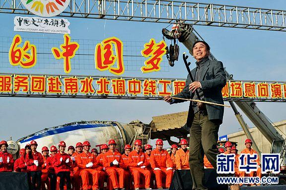 當(dāng)日,由中國文聯(lián)和國務(wù)院南水北調(diào)辦公室主辦的“我們的中國夢(mèng)——文化進(jìn)萬家”慰問團(tuán)先后來到河南鄧州湍河渡槽施工段現(xiàn)場(chǎng)及湖北丹江口蔡灣村移民安置點(diǎn),和參與南水北調(diào)工程建設(shè)的工人、移民群眾熱情聯(lián)歡。姜昆、馮鞏、小香玉、呂薇等文藝工作者為在場(chǎng)的工人、群眾獻(xiàn)上了精彩的文藝節(jié)目。(記者 孟菁 攝)