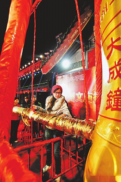 央廣網(wǎng)河南分網(wǎng)消息 據(jù)河南日報報道:2014年1月1日零點,一場撞鐘迎新年的活動在鄭州文廟成功舉辦。伴隨著大成鐘108次鳴響,來自我省各行各業(yè)的杰出代表和群眾在鐘聲中辭舊迎新,祈求一年四季平安如意。(記者 王錚 欒姍 攝)