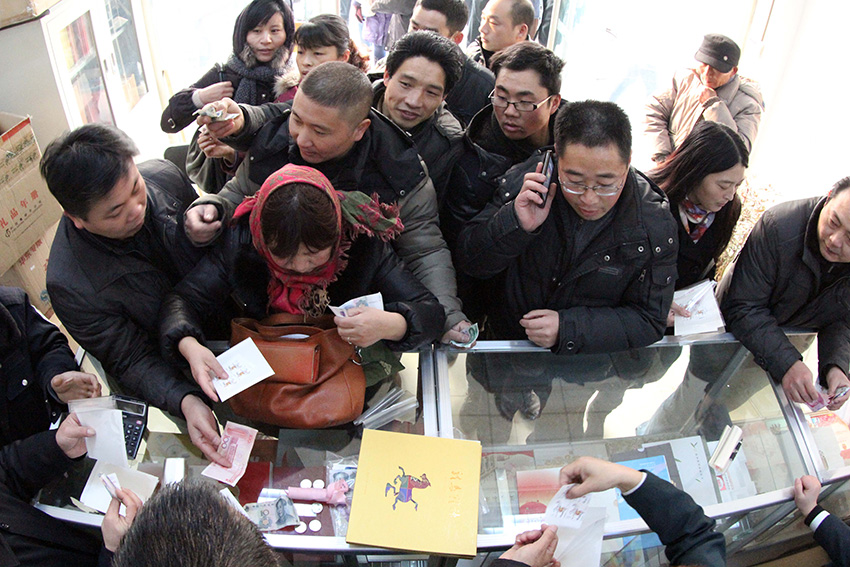 1月5日,集郵愛(ài)好者在江蘇省連云港市贛榆縣郵政局購(gòu)買(mǎi)《甲午年》生肖“馬”郵票。(司偉 攝)