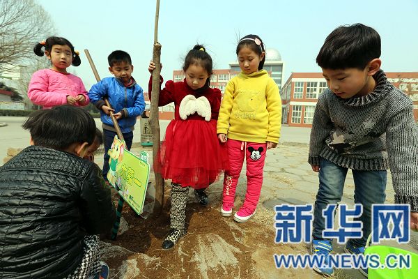 3月10日,河南省安陽市婦女兒童活動中心幼兒園的孩子們在院內(nèi)栽植綠化景觀樹。