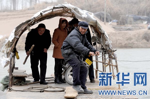 3月12日,王丙新老人抓著連接兩岸的鋼絲繩來擺渡小船。