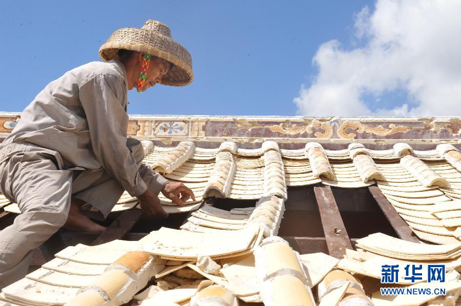 7月22日,海南省文昌市翁田鎮(zhèn)龍馬西村村民云惟平在房頂上修補(bǔ)瓦片。