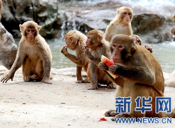 7月22日,鄭州市動物園里的獼猴在吃西瓜祛暑。