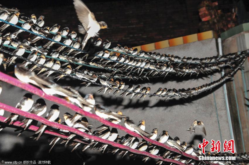 央廣網(wǎng)河南分網(wǎng)消息 據(jù)中新網(wǎng)報(bào)道:2014年8月14日傍晚,廣東省茂名市高州曹江鎮(zhèn)出現(xiàn)萬燕“歸巢”的壯觀景象。暮色中,成千上萬的燕子盤旋在曹江圩街上空,唧唧喳喳的鳥鳴不絕于耳,隨后燕子紛紛落腳在電線,像五線譜上的無數(shù)音符。圖片來源:CFP視覺中國