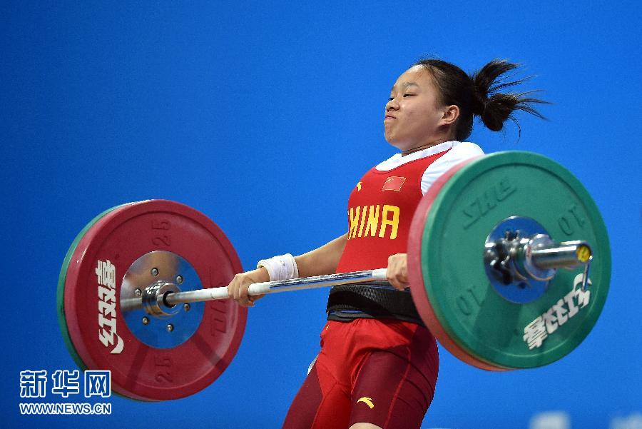8月17日,中國選手蔣惠花在比賽中。當(dāng)日,2014南京青奧會舉重項(xiàng)目比賽在南京國際博覽中心開賽。在女子48公斤級比賽中,中國選手蔣惠花以193公斤總成績奪冠。(記者郭程攝)