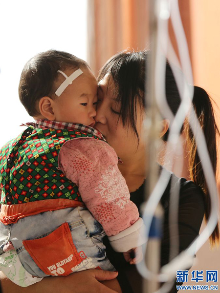 11月26日,一名家長在河南省武陟縣第一人民醫(yī)院兒童輸液室安撫孩子。