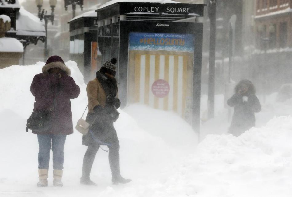 當(dāng)?shù)貢r(shí)間2015年2月15日,美國波士頓遭遇暴風(fēng)雪襲擊,波士頓科普利廣場的行人在大雪中。